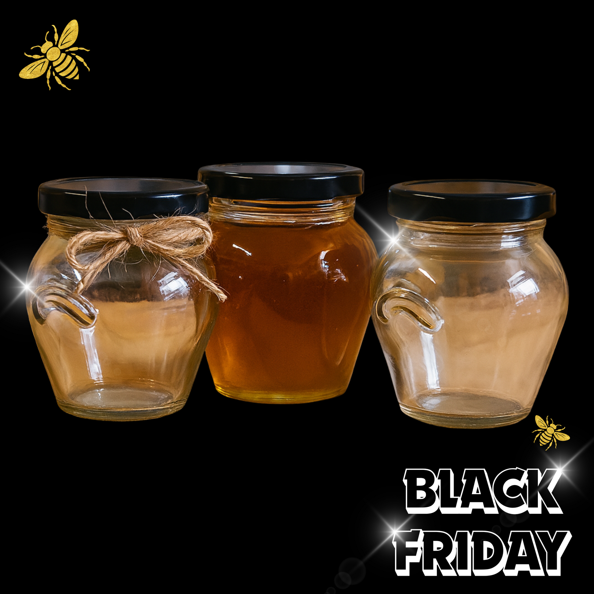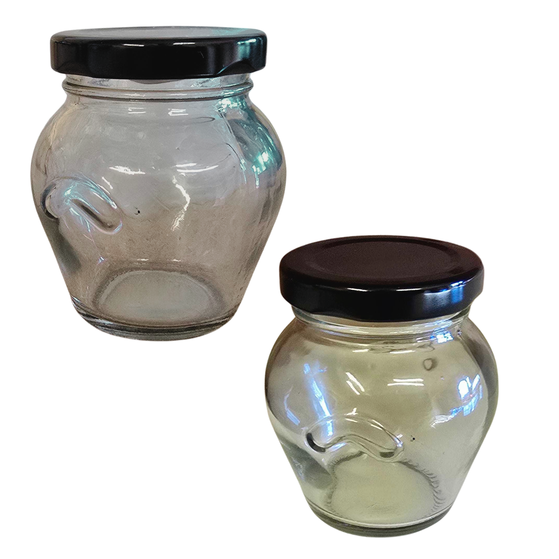 Orcio Glass Jars with black lids offer a clear glass design and charming raised handles for an elegant touch. Perfect for honey storage, these pots combine practicality with style.