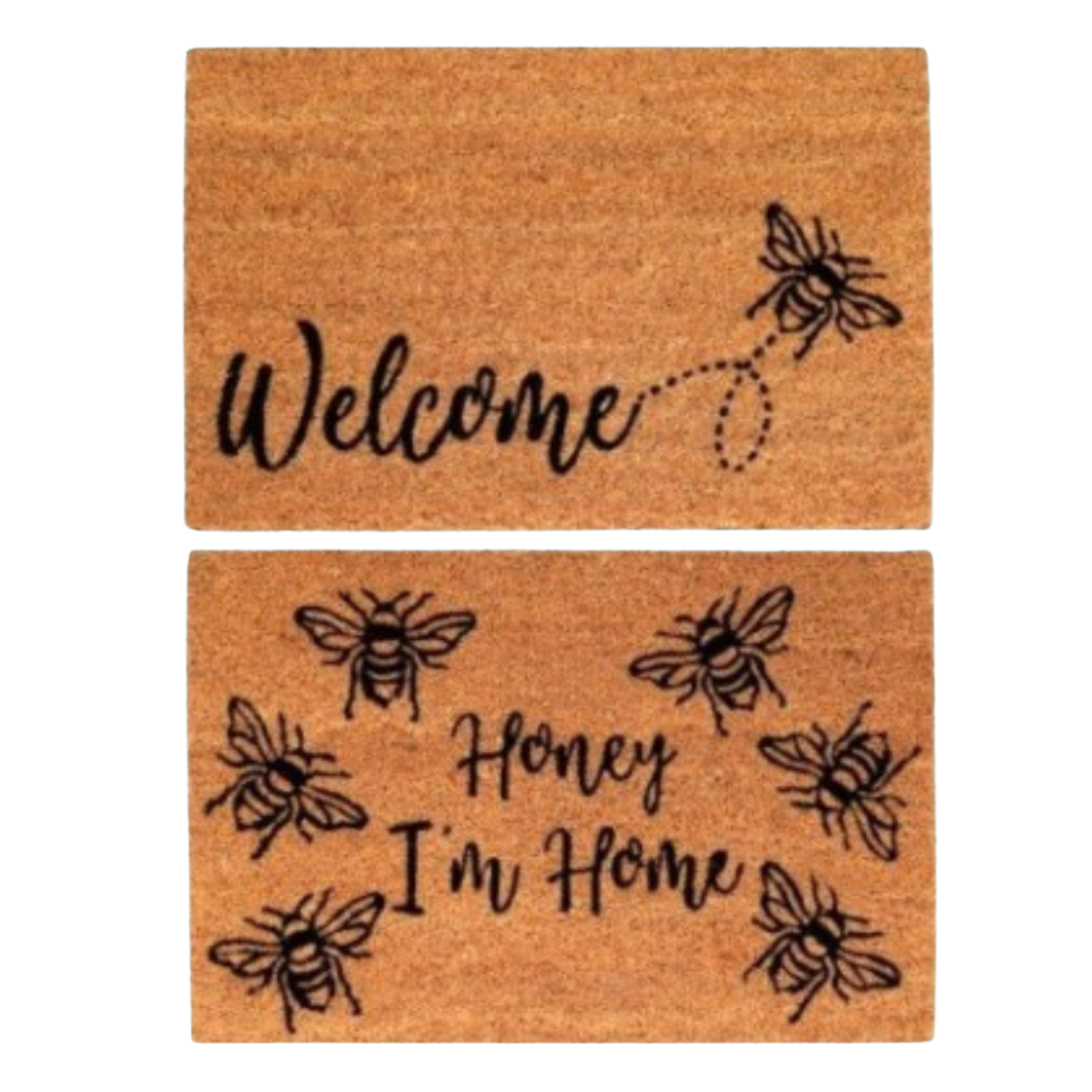 A durable coir Door Mat, choose between 'Welcome' or 'Honey I'm Home'. Perfect for indoor use, but please note the design and text may fade faster if used outdoors. Measures 60cm x 40cm. Simply select your preferred design.