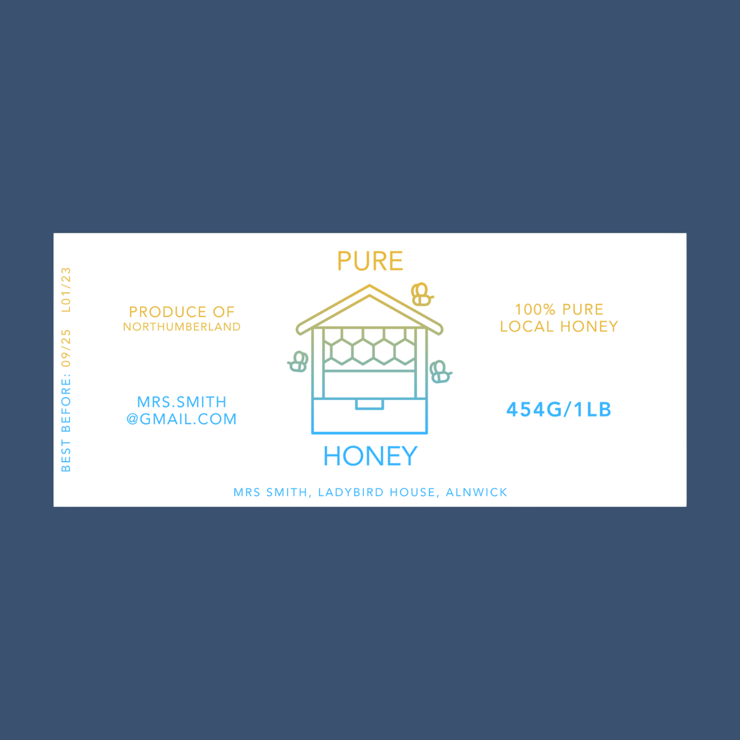 Honey Title - this can be your town, county, your name, whatever you would like! Please make sure to complete all text fields marked with a *, as honey labels have many legal guidelines. We will use your information in the design you select and print it for you. Be sure to accurately fill in all text boxes, as unfortunately we are unable to refund any labels printed with incorrect information. In some cases, we may need to make slight changes to the design, to accommodate your requirements. If you have a particularly lengthy address or an extensive honey name, we will try our best to accommodate you.