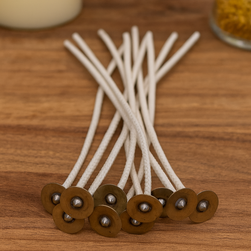 Waxed, flat candle wicks with sustainer attached to one end - ideal for floating candles and candles for glass jars. Equivalent to our 2/0 wick.